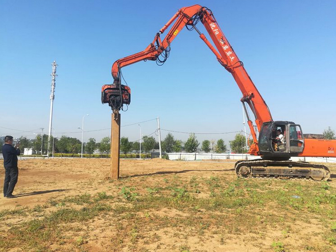 振动打桩机主要安装在挖掘机上使用,挖掘机包括陆地上的挖掘机和水陆两用的挖掘机挖掘机打桩机主要用于打桩,桩的类型包括管桩、钢板桩钢管桩、混凝土预制桩、木桩及光伏桩等。振动式沉拔桩锤是利用其高频振动,以高加速度振动桩身,将机械产生的垂直振动传给桩体,导致桩周围的土体结构因振动发生变化,强度降低。桩身周围土体液化,减少桩侧与土体的摩擦阻力,然后以挖机下压力、振动沉拔锤与桩身自重将桩沉入土中。拔桩时,在一边振动的情况下,以挖机上提力将桩拔起。打桩机械所需要的激振力要根据场地土层、土质、含水量及桩的种类、构造而综合确定。高频液压振动打桩机,是运用振动式沉桩打拔桩,特别适用于市政、桥梁、围堰、建筑地基等中短桩工程。